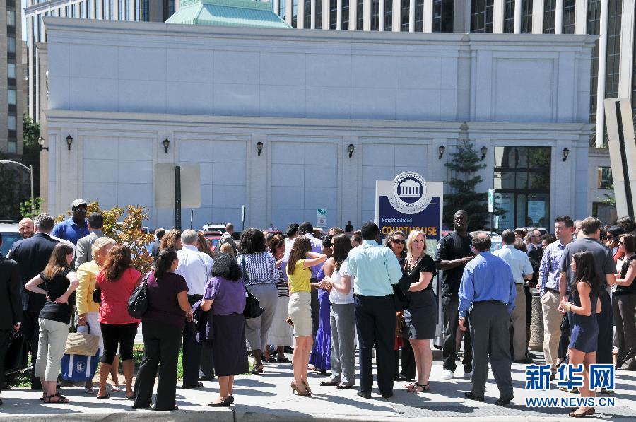 8月23日,在美國弗吉尼亞州阿靈頓縣,人們在地震發(fā)生后聚集在室外。美國東部地區(qū)于美國東部時間23日13時51分(北京時間24日1時51分)發(fā)生里氏5.9級地震,首都華盛頓及紐約有明顯震感。新華社記者冉維攝