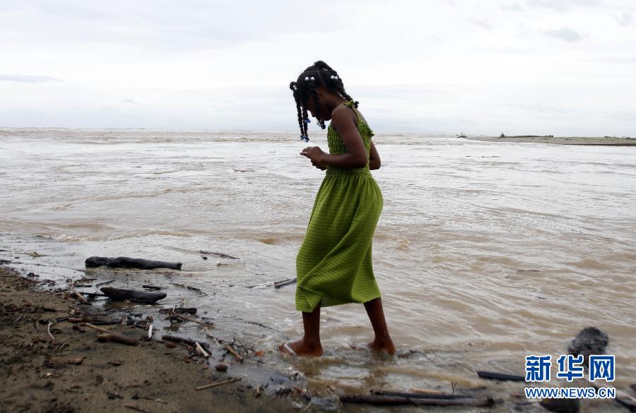 8月23日,在多米尼加共和國城市納瓜,一個女孩走過滿是樹木殘骸的海灘。