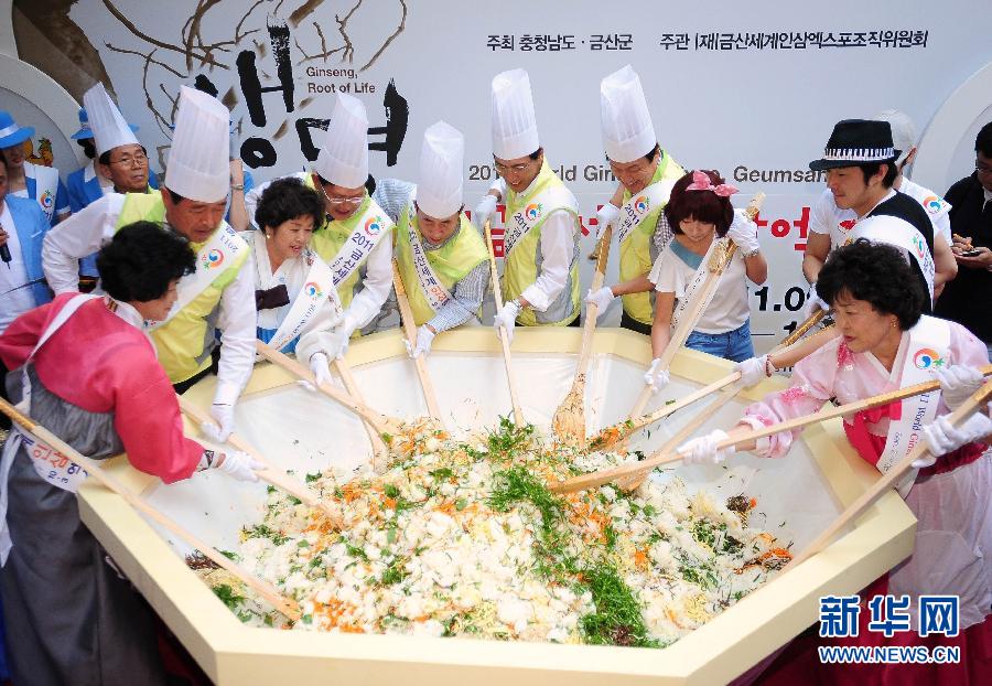 8月25日,韓國官員與志愿者在首都首爾共同制作巨型人參拌飯,宣傳2011年世界人參博覽會。