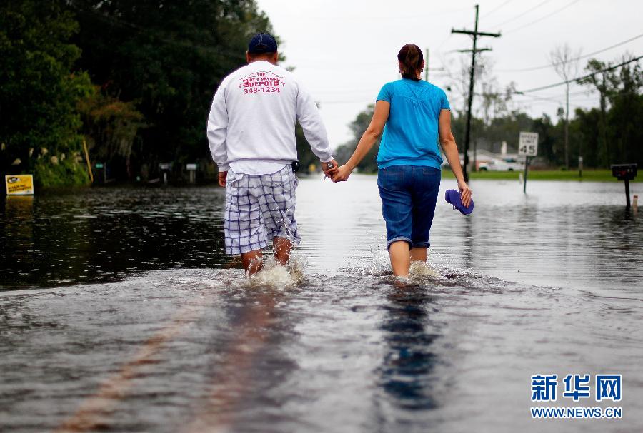 9月4日,在美國路易斯安那州克朗波因特,一對夫婦牽手趟過積水的街道。熱帶風(fēng)暴“李”4日清晨在路易斯安那州拉斐特市西南大約80公里處登陸,給該州東南部多地帶來超過50厘米降水,可能引發(fā)多地洪災(zāi)。