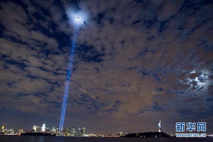 9月8日晚,兩道強(qiáng)光從紐約世貿(mào)中心遺址的兩個(gè)倒塌的大樓底座處直刺天際,以此紀(jì)念9·11十周年。