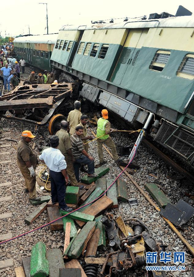 一輛列車13日晚在距印南部港口城市金奈約80公里處撞上了另一輛停在鐵軌上的列車,目前已造成9人死亡,100多人受傷。 新華社/法新