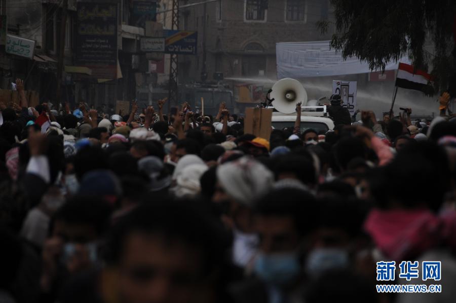 9月18日,警方防暴車使用高壓水槍驅散人群。當日,也門數萬名反政府示威者在首都薩那與政府安全部隊發生沖突,導致至少26名示威者死亡,100多人受傷。 新華社發(穆罕默德攝)