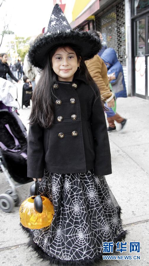 10月31日,在美國紐約皇后區萬圣節慶祝活動上,兒童在商鋪門前討糖。當日是一年一度的萬圣節,紐約市民走上街頭舉行各種慶祝活動。新華社記者王成云攝
