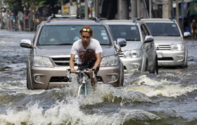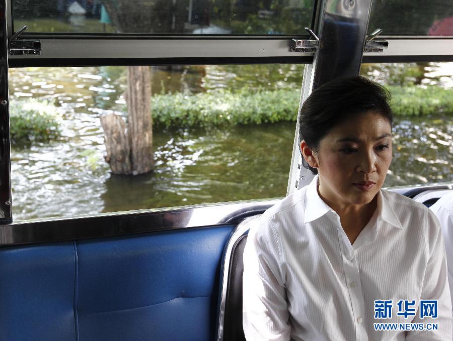 11月7日,在泰國(guó)曼谷洪水災(zāi)區(qū),泰國(guó)總理英拉坐在一輛車上。泰國(guó)總理英拉8日說(shuō),由于國(guó)內(nèi)洪災(zāi)依然嚴(yán)峻,她決定取消出席亞太經(jīng)合組織(APEC)第19次領(lǐng)導(dǎo)人非正式會(huì)議的行程,由副總理兼商業(yè)部長(zhǎng)吉滴叻代為出席。英拉說(shuō):“所有泰國(guó)人現(xiàn)在應(yīng)齊心協(xié)力,幫助國(guó)家走出這場(chǎng)洪水危機(jī)。” 新華社/路透