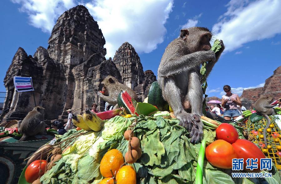 11月27日,在泰國首都曼谷以北150公里的華富里府,一些猴子在寺廟前舉辦的“猴子的宴會”活動中享受自助大餐。當天,一年一度的“猴子的宴會”活動在這里舉行。猴子們可以盡情享用超過2000公斤的水果和蔬菜。華富里以猴子眾多聞名,每年都為當地吸引來大量觀光客。新華社/法新
