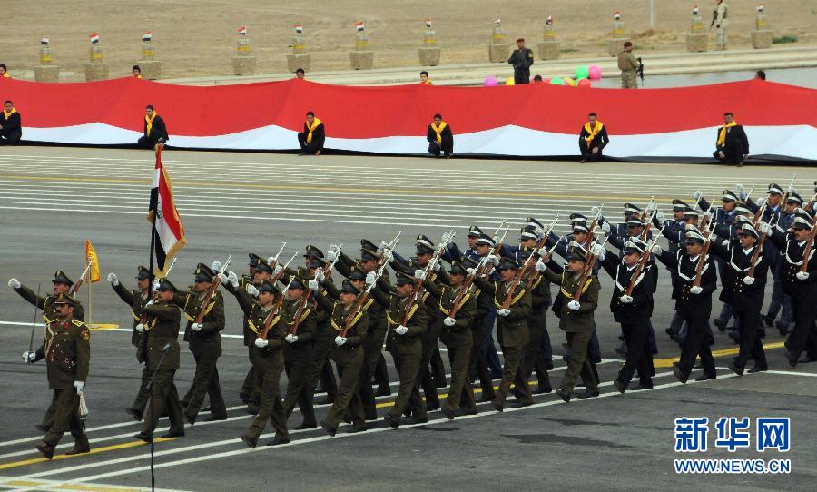 1月6日,在伊拉克首都巴格達,儀仗隊參加建軍節閱兵式。伊拉克6日在首都巴格達舉行慶祝建軍91周年閱兵式,這是美國撤軍后伊拉克首次慶祝建軍節。伊拉克步兵、裝甲部隊、火炮部隊等和直升機、戰機編隊參加了閱兵式。新華社記者張寧攝