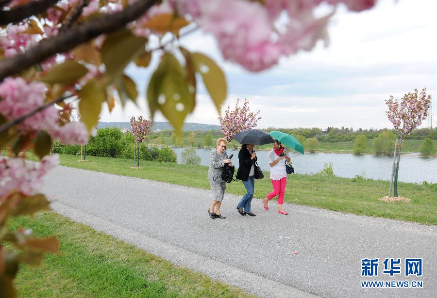 4月19日,在奧地利維也納多瑙島上,游客徜徉在櫻花林里。這片櫻花林是日本藝術(shù)家團體于2002年栽種的,是維也納市建市1000周年時作為禮物從日本各界接受的1000棵櫻花樹的一部分。