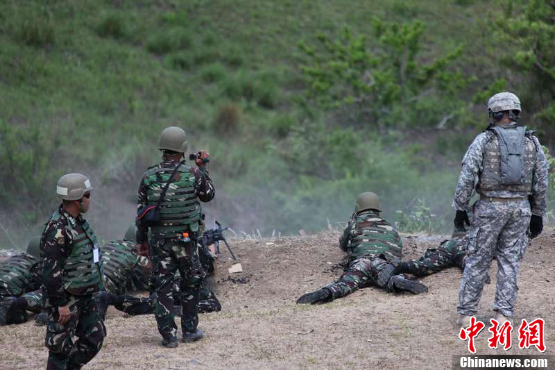 4月21日,美國與菲律賓“肩并肩2012”聯合軍事演習參演部隊在菲國北部新怡詩夏省麥格賽賽堡舉行實彈演習。圖為當天下午,菲方士兵在美軍軍官指導下開展實彈演練。張明 攝