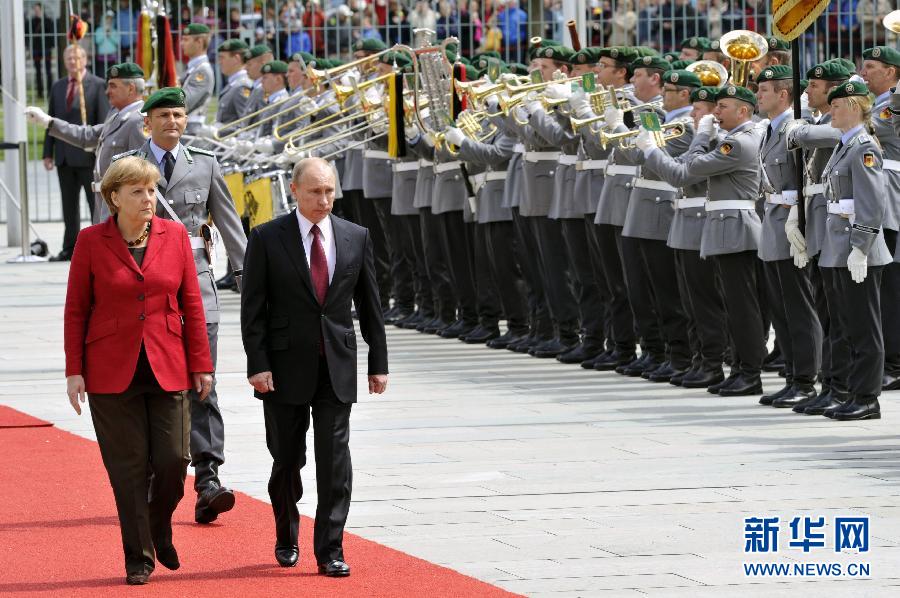 6月1日,在柏林的德國總理府,德國總理默克爾(左)和俄羅斯總統普京在歡迎儀式上檢閱儀仗隊。當日,俄羅斯總統普京訪問德國,并與德國總理默克爾在柏林舉行會談和聯合新聞發布會。 新華社記者 馬寧 攝