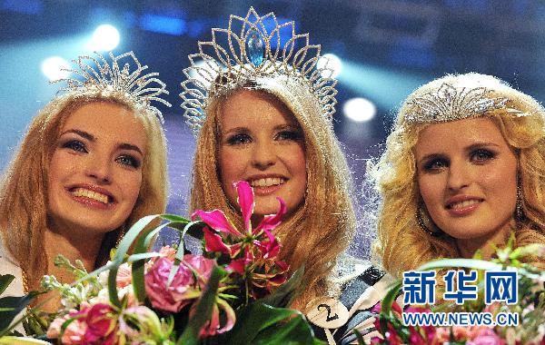 4月9日,在斯洛伐克東部的波普拉德,獲得2011年斯洛伐克小姐選美大賽冠軍的米海拉(中)和亞軍杜沙娜(左)、季軍露比卡合影。新華社/法新