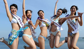 4月21日,參賽選手在放飛和平鴿。當日,2011國際旅游小姐中國總決賽選手在遼寧大連旅順口進行文化巡游活動。選手們登上旅順老鐵山體驗歷史文化,在和平公園放飛和平鴿祈求和平,并身穿比基尼泳裝進行宣傳展示。新華社發(姜冰 攝)