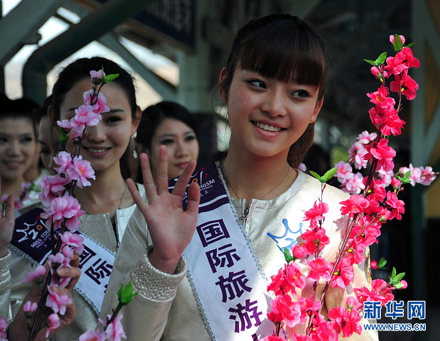 當日,2011國際旅游小姐中國總決賽在遼寧省大連市旅順老火車站舉行入城儀式。從20日起到26日,來自全國各地的50位參賽選手除在大連進行總決賽比賽外,還將參加富有特色的文化及公益活動。新華社發(姜冰 攝)