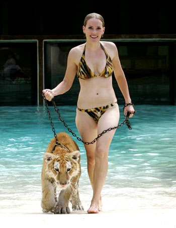 據英國《每日郵報》報道,在海邊的游泳者要不時巡視海面以防大鯊魚,不過,對于美國南卡羅萊納州一家動物園的女馴獸師來說,與小老虎們一起游泳已是她們的例行工作。
