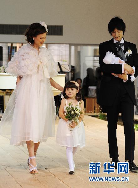 7月21日,在日本首都東京,模特在展示婚禮服裝。當日,日本服裝設計師岡正子在日本首都東京舉行以環;榧啚橹鞯臅r裝秀。作品用從玉米等植物中提取的聚乳酸為原料,加工成可生物降解纖維,輔以絲綢、紙等綠色環保材料設計而成,旨在倡導低碳綠色的時尚生活。新華社記者 季春鵬 攝