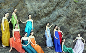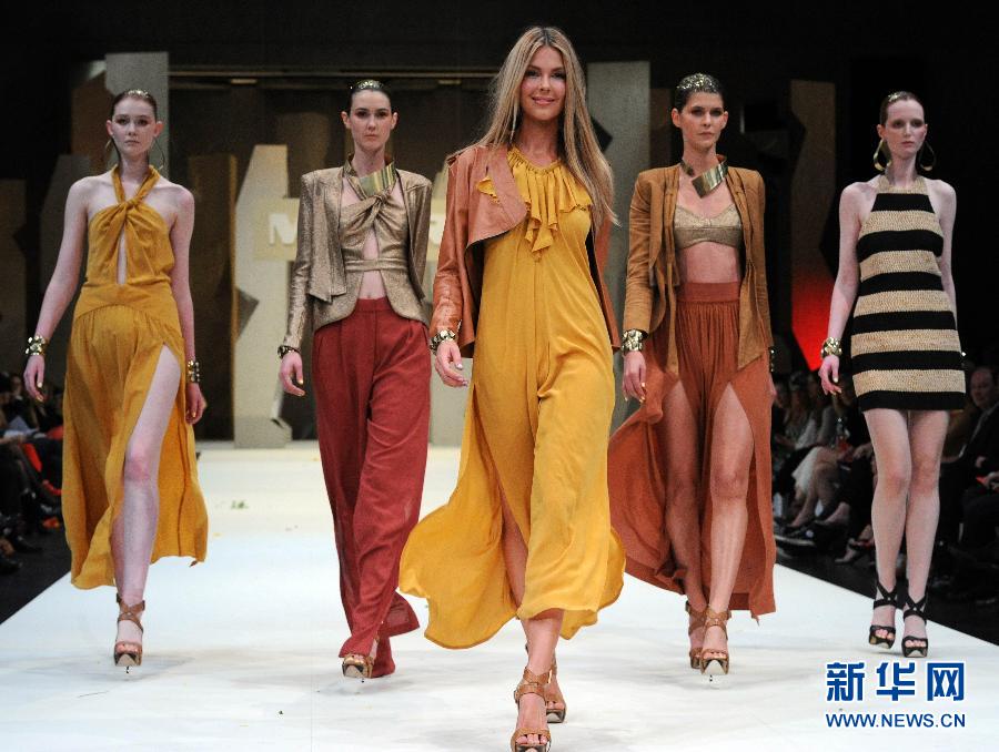 8月11日,在澳大利亞悉尼,前“環(huán)球小姐”珍妮弗·霍金斯(中)身穿“Manning Cartell”時裝在邁爾春夏時裝秀上走臺。一年一度的邁爾春夏時裝秀是澳大利亞設(shè)計師的盛宴,每年都有超過30名澳大利亞知名設(shè)計師攜作品參加。 新華社/法新