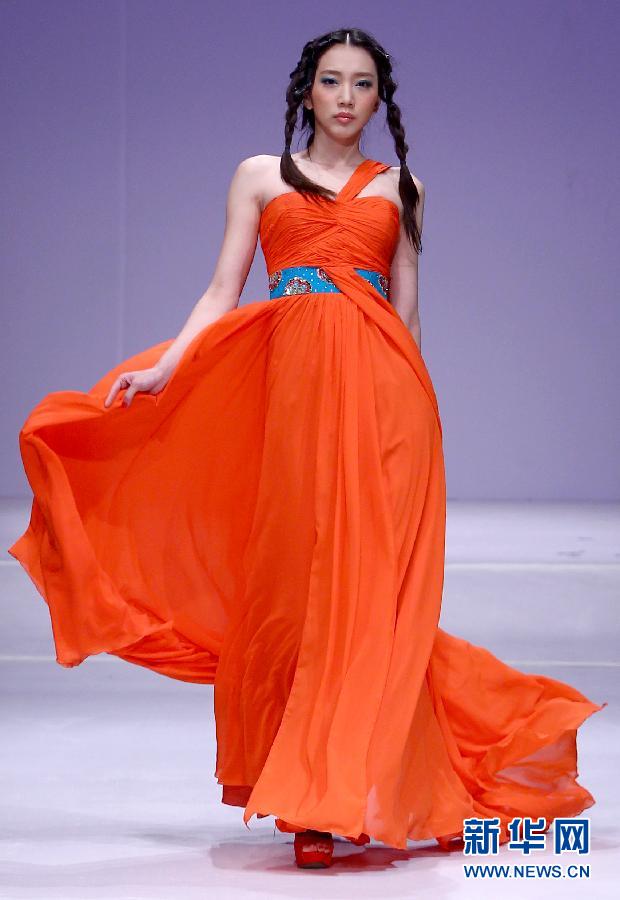 模特展示著名時裝設計師屈汀南設計的時裝(10月28日攝)。 10月28日,“屈汀南2012春夏時裝發布會”在北京舉行的中國國際時裝周上亮相。 新華社記者 陳建力 攝