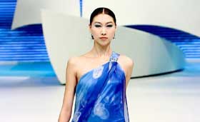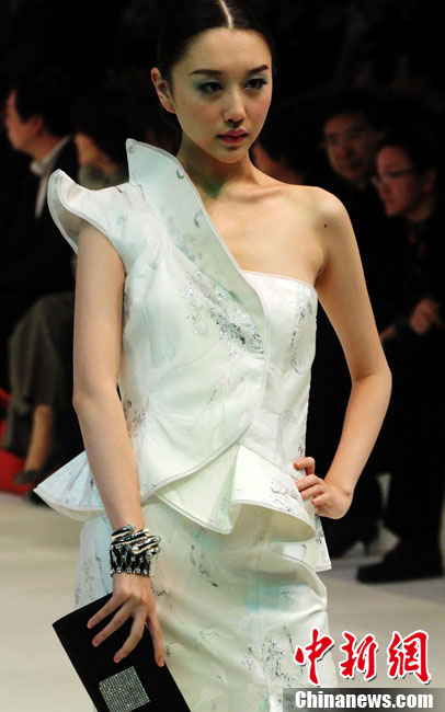 11月1日,在北京舉行的中國國際時裝周(2012春夏系列)發布落下帷幕。圖為模特展示白領-“藍色與夢想”春夏高級成衣發布會作品。中新社發 錢興強 攝