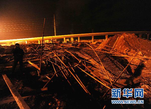 6月2日晚上,云南省昆明市一座正在修建的立交橋發(fā)生施工腳手架坍塌事故,造成多名施工人員傷亡,其中3人死亡。這是坍塌事故現(xiàn)場。新華社記者楊宗友攝