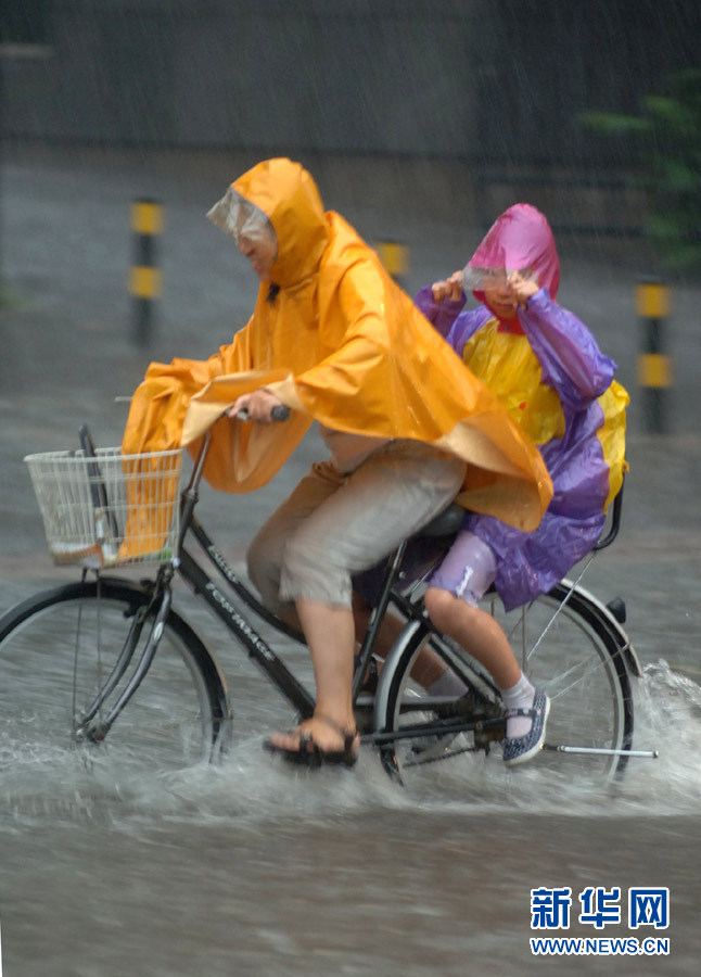6月23日,北京西城區(qū)一所小學(xué)附近,一位家長(zhǎng)帶著孩子在雨中騎行。當(dāng)日下午,北京遭遇強(qiáng)雷雨天氣,白晝?nèi)缫梗o行人出行帶來不便。 新華社記者趙琬微攝
