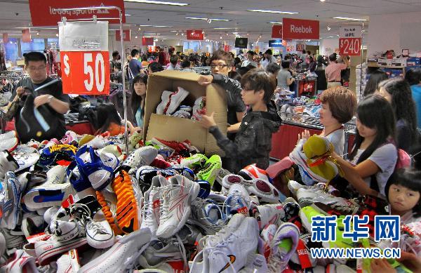 7月14日,顧客在銅鑼灣一家商廈選購打折商品。進入暑期以來,香港各大商場開展多種形式的商品促銷活動,以吸引各地顧客。進入暑期以來,香港各大商場開展多種形式的商品促銷活動,以吸引各地顧客。
