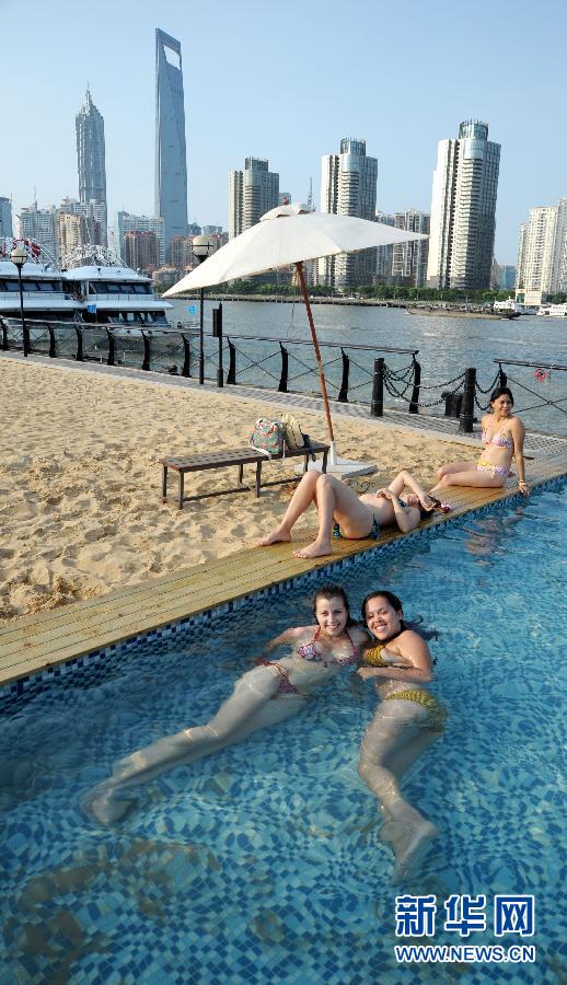 7月27日,游客在上海外灘“沙灘泳池”游泳避暑。“沙灘泳池”位于南外灘老碼頭人造沙灘內,游客可以在此戲沙、游泳,同時享受浦江兩岸美景。