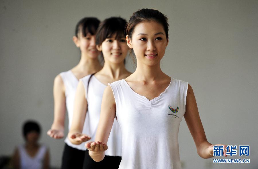 350位來自各大院校的頒獎禮儀志愿者,將在8月12日開幕的大運會中承擔306場比賽的頒獎禮儀工作。290位青春靚麗的女生與60位陽光帥氣的男生正并肩作戰,接受培訓團隊的“打磨”和“雕琢”,期待在“青春盛會”展現大學生形象和風采。這是禮儀志愿者正在進行托盤動作訓練(7月30日攝)。 新華社記者梁旭攝