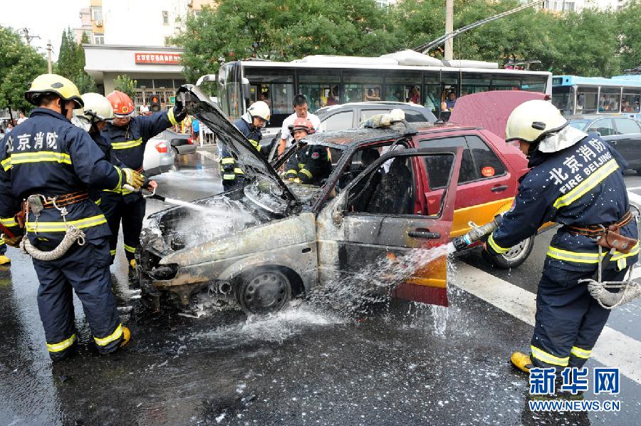 8月2日,在北京市東城區安外大街,聞訊趕來的消防人員向自燃車輛噴水滅火。 當日,在北京市東城區安外大街,一輛出租車在行駛中自燃,沒有造成人員傷亡。 新華社發(胡慶明 攝)