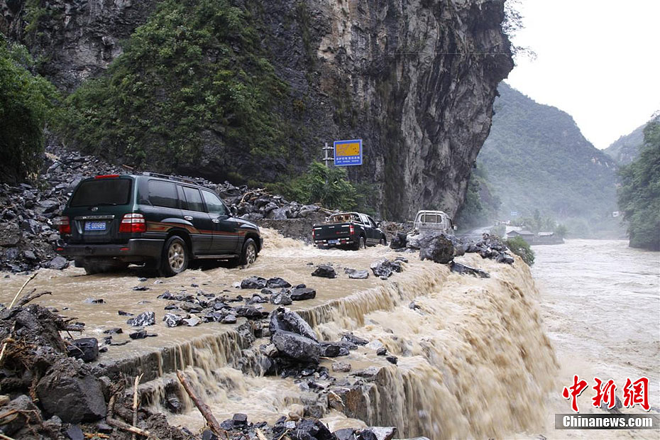 8月22日凌晨3時,湖北興山縣普降大雨,導致山洪暴發、河水猛漲,全縣3條交通干線、30多條村級公路多處塌方,交通中斷,滯留車輛近百輛,百余人被困。中新社發 鄒遠景 攝