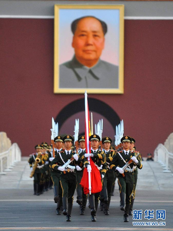 10月1日,國旗護衛隊戰士護送國旗走向升旗臺。當日,來自全國各地的十二萬余名群眾匯聚北京天安門廣場,觀看隆重的升旗儀式,慶祝中華人民共和國成立62周年。新華社記者 羅曉光 攝