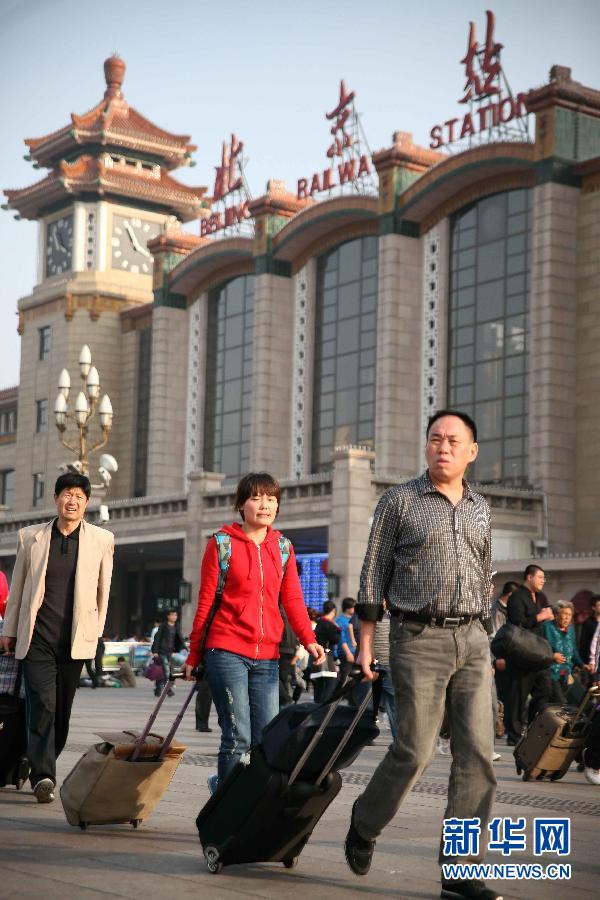 10月5日,返程旅客從北京火車站出站。當日是國慶黃金周的第5天,外出游玩或探親的旅客陸續返程,各地火車站客流呈現增長態勢。 新華社發(陳曉根 攝)