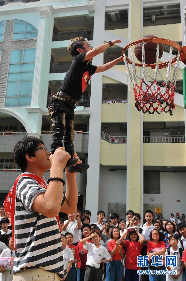 10月18日,張歡(下)、徐國元(上)在活動中表演扣籃。當日,身高2.38米、來自山東省的巨人張歡和身高1.02米、來自江蘇省的袖珍人徐國元亮相澳門培正中學,為大家展示籃球技術,并與學生們互動交流。新華社記者 張金加 攝