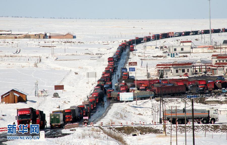 10月25日,在新疆哈密省道303線,因降雪受阻的車輛排起了長(zhǎng)隊(duì)。