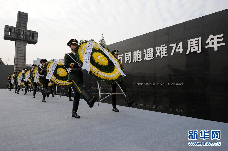 12月13日,武警戰(zhàn)士在集會(huì)上為南京大屠殺遇難同胞敬獻(xiàn)花圈。