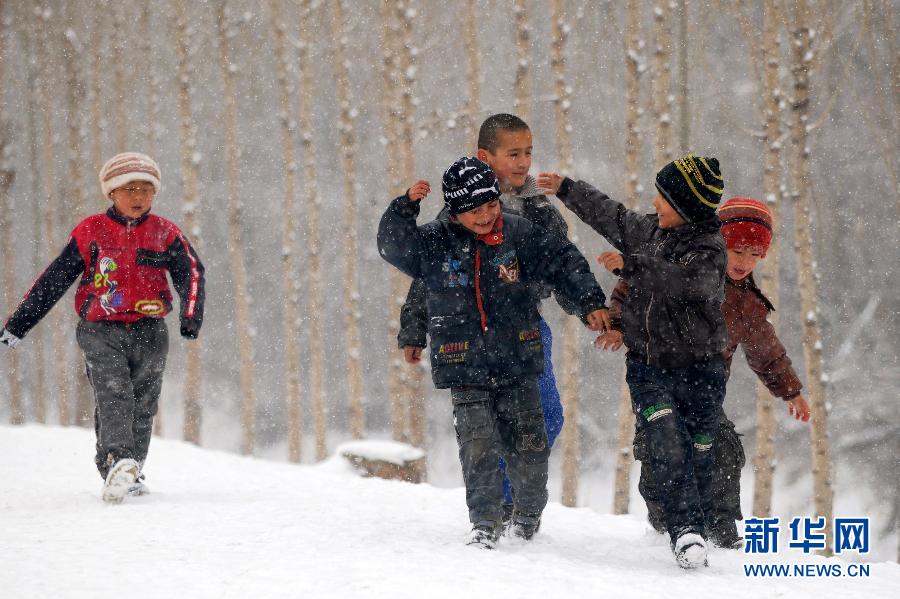 12月13日,在新疆鞏留縣東買里鄉莫因格則村,幾名剛剛放學的小朋友冒雪走在回家路上。當日,新疆伊犁河谷普降小雪,氣溫有所下降。據自治區氣象臺發布的天氣預報顯示,從12月12日午后到14日,北疆大部、天山山區和南疆西部山區的部分地區有微到小雪,其中伊犁河谷、塔城、阿勒泰等地的局地有中到大雪。新華社記者 王菲 攝