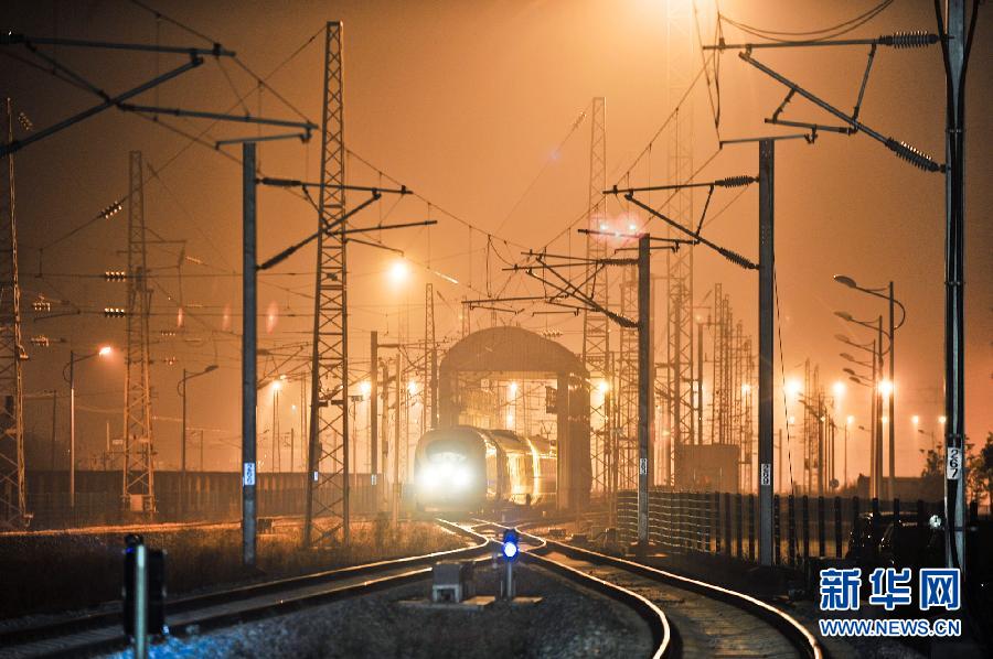 1月9日深夜,將要檢修的動車朝車庫駛來。新華社記者 白禹攝