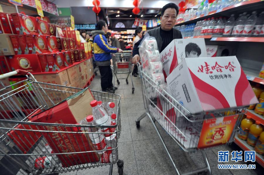 1月25日,人們在廣西柳州一超市內搶購瓶裝飲用水! ∪涨埃瑥V西河池宜州市境內的龍江河發(fā)生鎘濃度超標事件,受此影響,1月24日晚間至25日,下游廣西柳州市的多個超市發(fā)生搶購瓶裝飲用水事件。據柳州水情部門監(jiān)測,目前,柳江干流水質安全! ⌒氯A社發(fā)