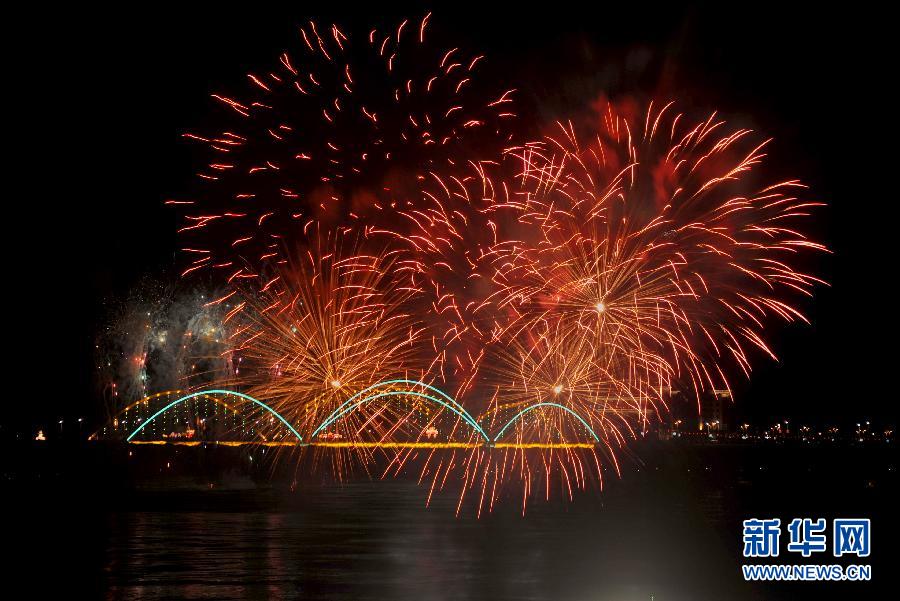 2月6日,在秦皇島市山海關區舉行的焰火晚會上,璀璨的煙花與湯河大橋交相輝映。當日是農歷正月十五,全國各地以燃放煙花的形式慶祝元宵佳節的到來。 新華社記者 楊世堯攝