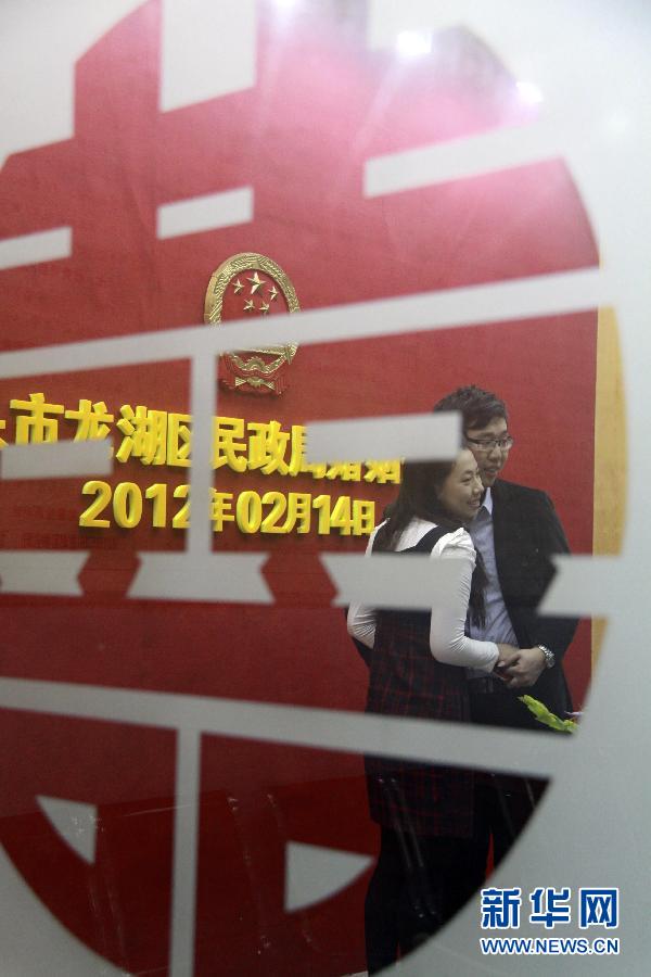 2月14日,一對新人在廣東省汕頭市龍湖區民政局結婚登記大廳辦理結婚登記手續。當日是情人節,許多情侶選擇在這一天登記結婚,讓這個浪漫的節日見證自己的愛情和幸福。新華社發(姚軍 攝)