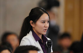 圍——代表委員一出現,眾記者立刻將其團團圍住。沒點兒體力的確難以接近。 苗慧 攝