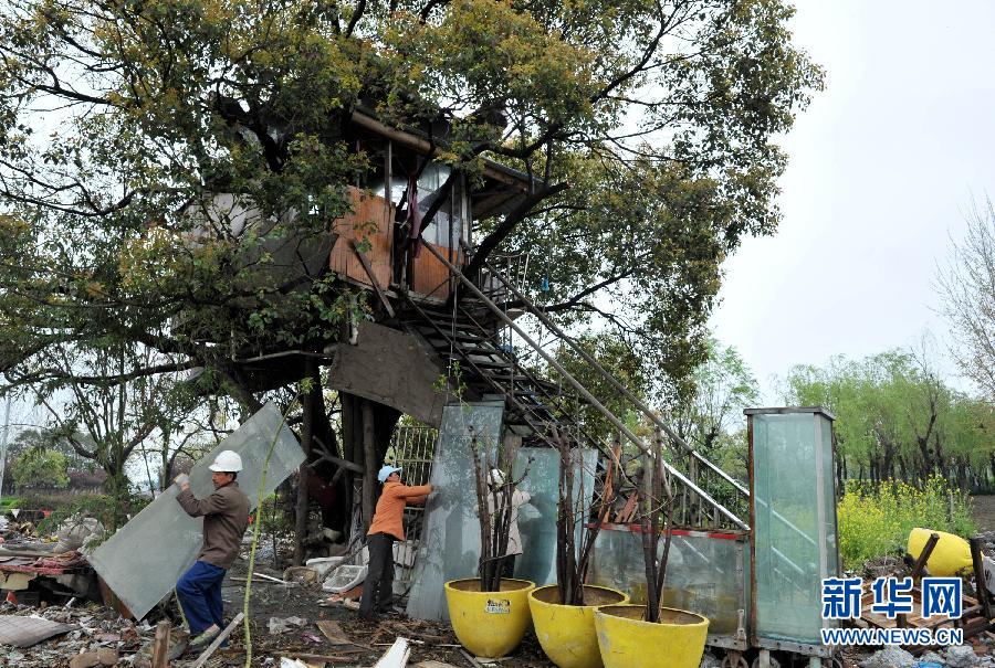 4月13日,工人在拆除“樹屋”。當日,上海浦東新區金橋鎮一座14平方米的“樹屋”因屬違章搭建,被正式拆除。據“樹屋”主人、66歲的黃崇高介紹,這是2005年建在一棵香樟樹上的小木屋,其中有床、衛生間、浴缸、電視機、音響等,屋頂還有一根避雷針,造價約8000元。新華社發(鈕一新 攝)