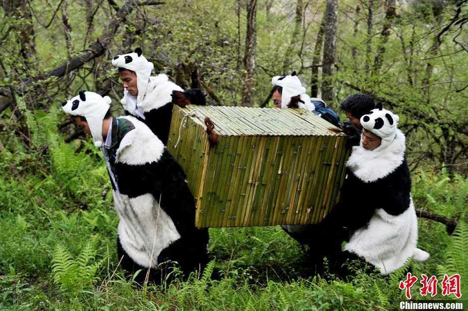 5月3日上午,在中國保護大熊貓研究中心臥龍核桃坪野化培訓基地,研究中心工作人員穿上特制的熊貓服,將全球首只在野化培訓基地出生的大熊貓“淘淘”及其母親“草草”引到二期野化培訓場門口裝籠的區域。為了避免危險,工作人員放棄了麻醉“淘淘”的方案,用鮮竹筍分別將它們引誘進了各自的籠子。隨后,在工作人員和武警協助下,母仔倆被順利轉移到附近的三期野化培訓圈。“淘淘”順利搬進新家,意味著“淘淘”已經圓滿完成了第二階段的野化培訓目標,正式進入第三階段培訓。臥龍大熊貓專家稱,若項目進展順利,“淘淘”有望于今年秋季正式回歸自然。衡毅 攝
