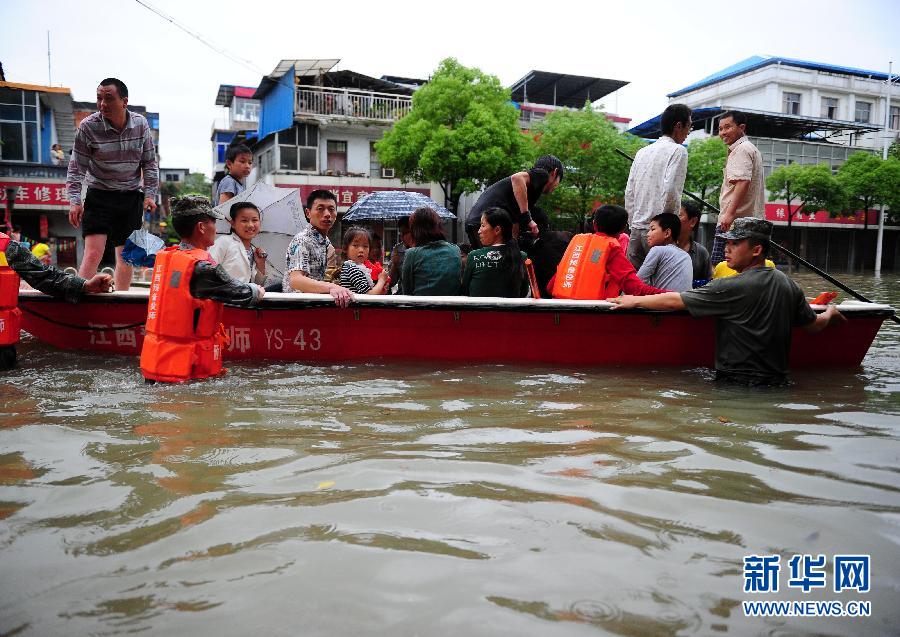 5月12日,江西預(yù)備役師官兵在南昌市青云譜區(qū)京山老街解救被困群眾。當(dāng)日,一場大暴雨突襲江西南昌,導(dǎo)致南昌城區(qū)出現(xiàn)嚴(yán)重內(nèi)澇,水淹最深處超過2米。江西省消防官兵、預(yù)備役師等緊急調(diào)集了4只皮筏艇和3艘沖鋒舟,冒雨轉(zhuǎn)移了200多名青云譜區(qū)京山老街被困群眾。新華社記者 周科 攝