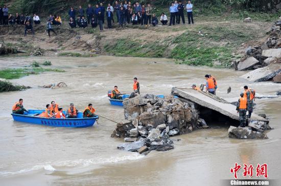 5月13日8點50分,湖南岳陽平江縣余坪鄉和梅仙鎮交界處的昌江河上一座名叫永固橋的三孔石拱橋被特大山洪沖擊垮塌,初步摸排事發時有9人掉入江中,現已確認救起3名落水者,尚有6人失蹤。楊華峰攝