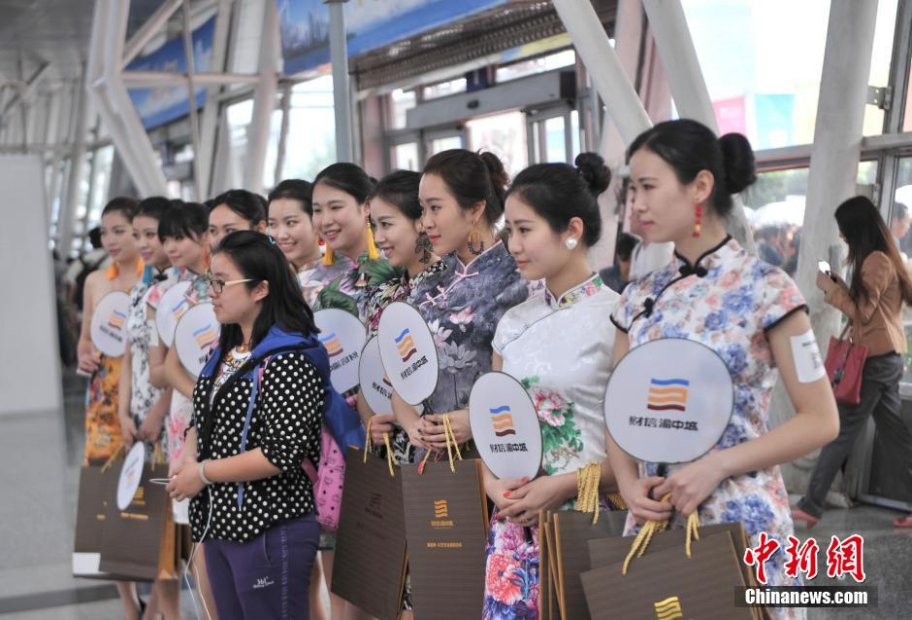4月17日,重慶房交會(huì)參展商家為吸引顧客眼球,工作人員穿著旗袍迎客。當(dāng)日,2014年重慶春季房產(chǎn)交易會(huì)在南坪國(guó)際會(huì)展中心舉行。陳超 攝