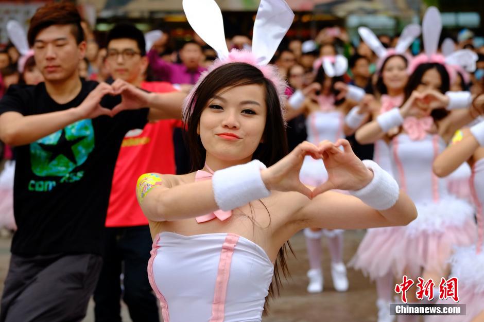 4月19日,北京某商場舉行復(fù)活節(jié)促銷宣傳活動(dòng),一群性感的“兔女郎”在街頭進(jìn)行“快閃”表演。中新社發(fā) 侯宇 攝