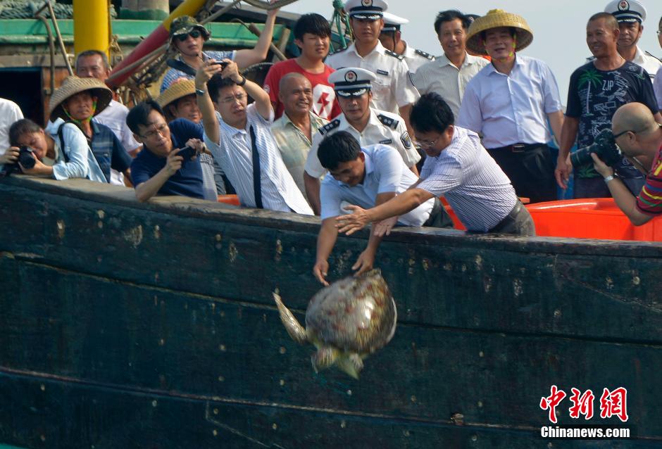 辦法》和瀕危水生野生動物宣傳冊等。中新社發駱云飛 攝,海南瓊海放生20余只海龜' />