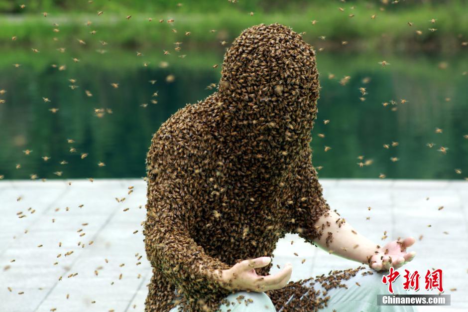 江西“第一蜂人”蜜蜂裹身53分鐘 創世界紀錄 (/)