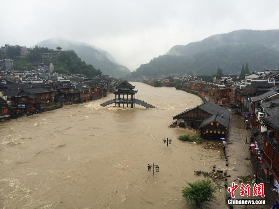 7月15日,受暴雨影響,湖南鳳凰古城出現嚴重內澇,導致沿江商戶和客棧低層被淹,古城內全城停電。目前,鳳凰各級部門正在全力營救受災群眾。15日,湖南各級氣象部門進入暴雨Ⅲ級應急響應狀態,暴雨預警由藍色升級為橙色,預計今明為省內降水最強時段大暴雨襲擊湘中以北。