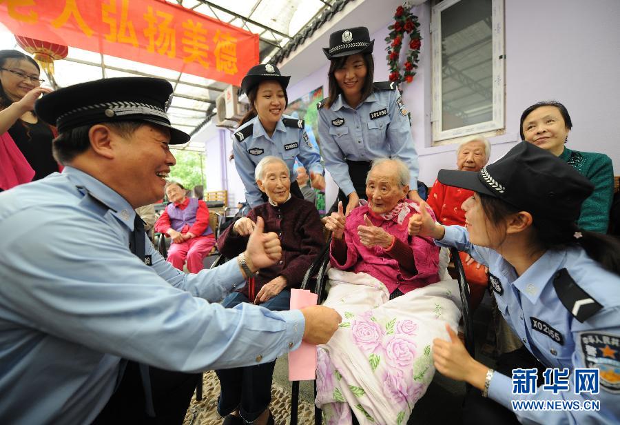 9月19日,賀維寧警官(左一)帶著幾位加入愛心敬老服務(wù)的新警員與張鏡園老人、張娟老人祝壽。當(dāng)日,江蘇南京玄武巡特警大隊等單位在南京博愛老年公寓為兩位孤寡老人姐妹——100歲的張鏡園和93歲的張娟舉辦生日慶賀會。長期幫助老人的公安民警、敬老愛幼公益組織“維寧工作室”的成員、眾多社會愛心人士以及老年公寓的職工、老人們歡聚一堂,共同給兩位“壽星”送上生日祝福。新華社記者孫參攝